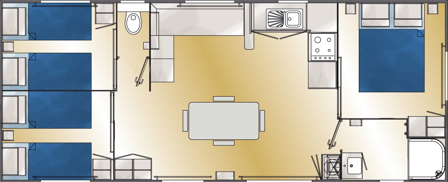 Ein 35 m² großes Mobilheim mit allem Komfort und 1 Badezimmer für bis zu 6 Personen.