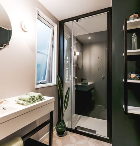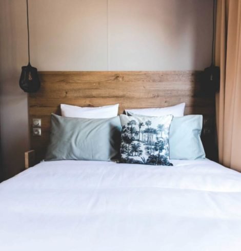 Un mobil-home de 32m² tout confort avec 1 salle de bain et toilettes séparées pour 4 personnes + 1 enfant – 12 ans avec superbe vue sur le lac.