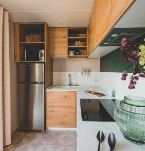 - Réfrigérateur avec mini congélateur, gazinière et micro-ondes
